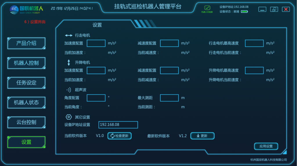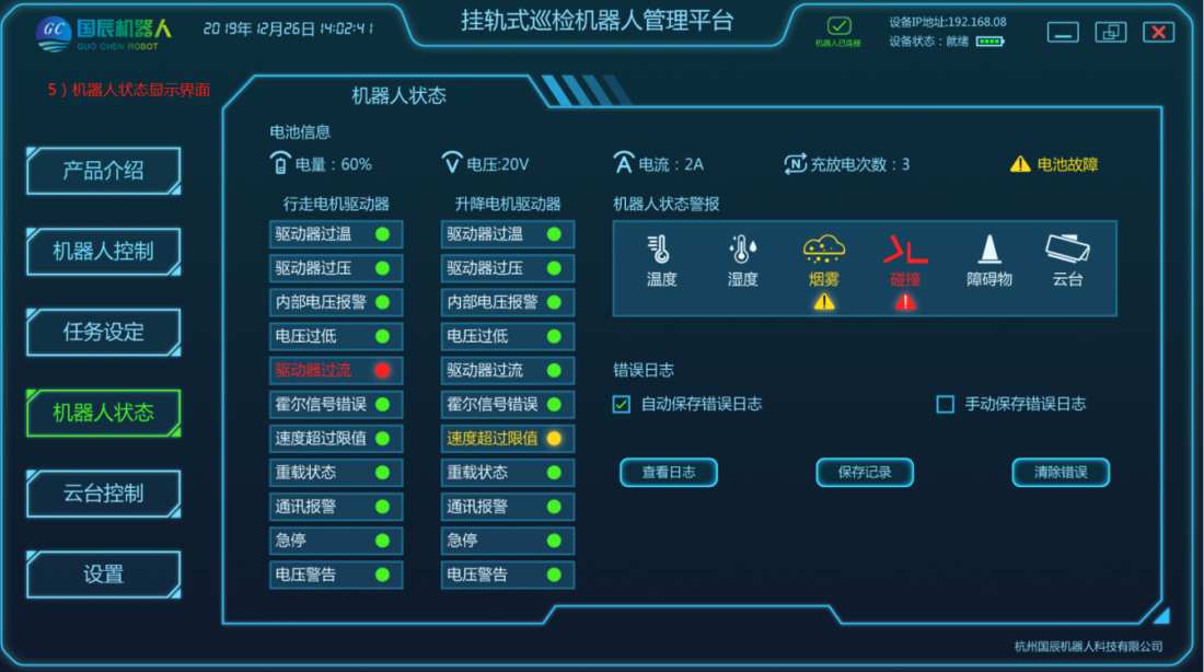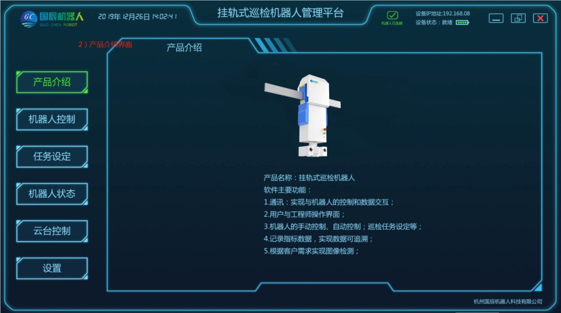 項目主要由移動機器人本體、軌道系統、采集設備、定位系統、供電和通信系統、后臺系統等結構組成。在巡檢工作過程中,由用戶設定任務點,加裝采集設備,移動機器人根據控制指令在軌道上運動,將采集設備運送到指定位置采集數據,且滿足所需要的負載量,速度;在機器人行駛過程中可實現自主爬坡、采集設備可根據監測物體高度進行升降調整等功能;配套的調試軟件支持手動、控制移動平臺運動;具有較強的適用性及拓展性,可自定義模塊搭配,自主設定任務點,自動巡檢、定點采集、自動充電等功能。